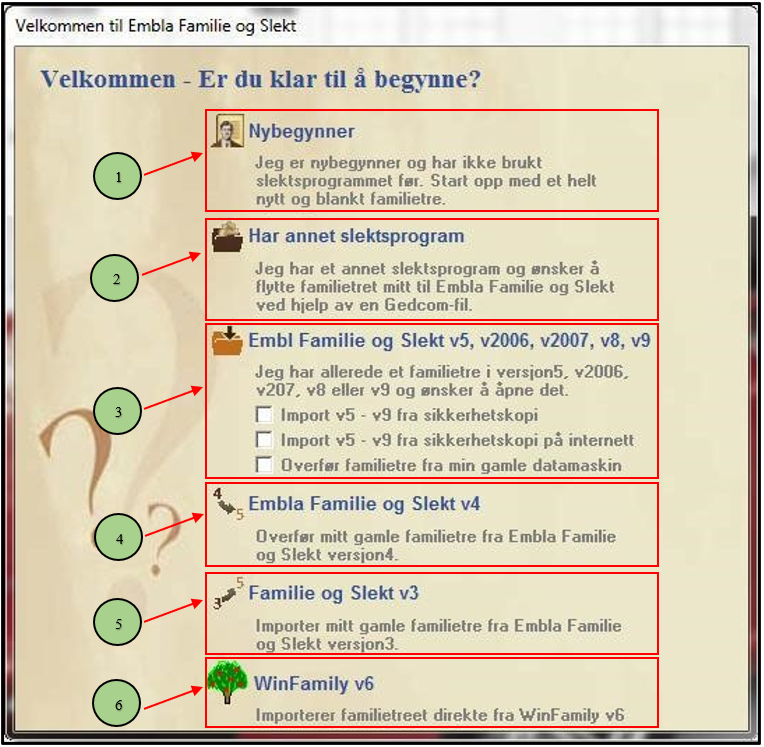 - Has a family tree created in Embla Family and Genealogy v5, v2006, v2007, v8 or v9. It is also possible to open a backup from these versions as well as to download a backup from the internet or from an old computer.
