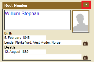 There are several ways to display information in Embla Famile and Genealogy. By clicking on the small white arrow at the top right of the main character box, it is possible to display more information about this person. See the picture below.