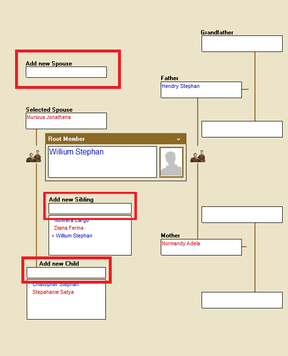 The first time you start, all the fields in the family tree will be empty. To expand the tree, first select the field where you want to add a new person. To “select” means to click once with the left mouse button. There are three different color types for a selected field:
