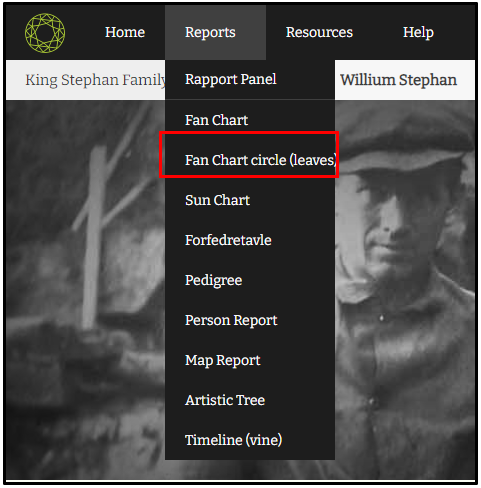 01)  The Fan Chart report is rendered artistically, akin to the traditional fan chart layout. Similar to the standard ‘fan chart’ report, this variant showcases the ancestors of the root person.