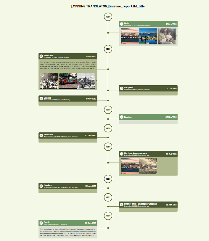 The Timeline report showcases various life events alongside the years pertinent to the selected root member