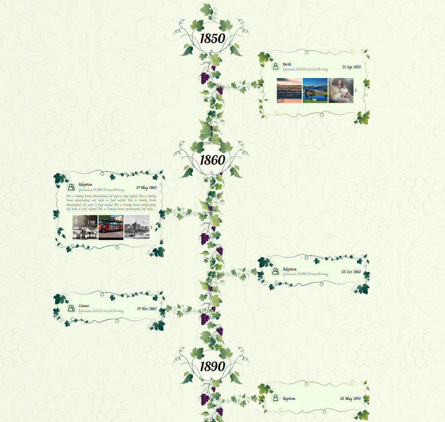 Each event box contains the event title, location, year, description, and any accompanying images uploaded.