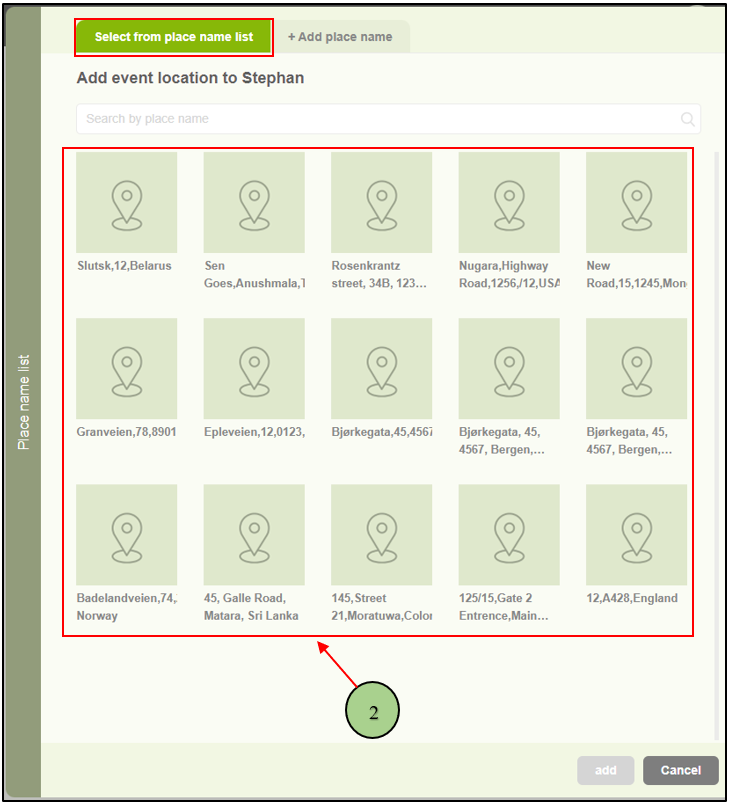 2. Upon clicking on the “Add place” button, a pop-up window will appear featuring two tabs. The first tab allows users to choose from existing locations.