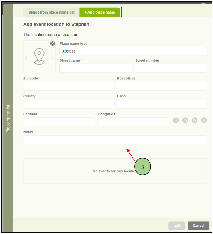 1. Users can add an event location by selecting the “Add place” button (+).