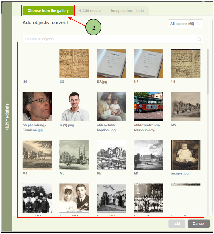 2. Upon clicking the “Add Multimedia” button, a pop-up window will appear presenting two tabs. The first tab, titled “Choose from Gallery,” allows users to browse existing media files and select one.