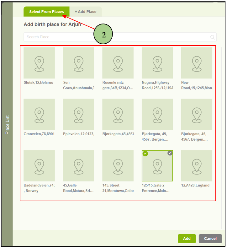 1. Users can add a Birthplace or a deathplace by clicking on the “+” icon in the member editor page