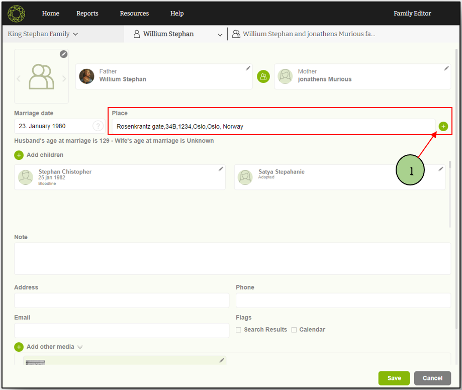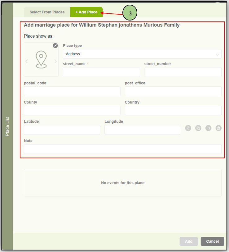 1. Users can add marriage place by clicking on the “+” icon display against the location text box in the family editor page