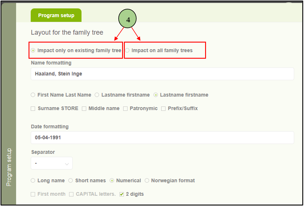 5. After selecting an option, users can customize the formatting for displaying names and dates according to their preferences. When the user alters the name formats, the formatting text box will display how the names will appear in the system, allowing the user to preview the changes.