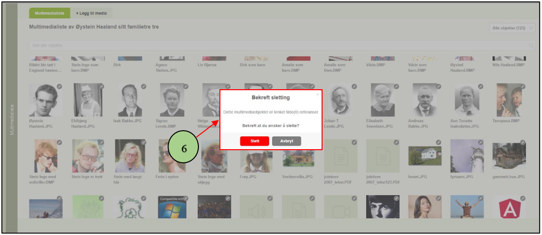 6. Ved å velge «Slett» fra redigeringsalternativene, vil en slettebekreftelsesmelding vises for å få bekreftelse før filen slettes og fjernes for godt fra familietreet.