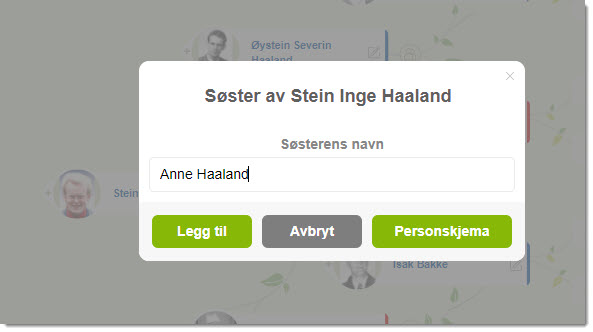 3) Ved å klikke på familietypen i menyen vises en dialogboks. Her er det mulig å registrere personen og hoppe tilbake til Oversiktsskjemaet eller gå videre til Personskjemaet og legge inn mer informasjon om det nye familiemedlemmet.