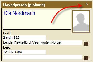 Det er flere måter å vise informasjon på i Embla Famile og Slekt .Ved å klikke på den lille hvite pilen helt oppe til høyre i boksen for hovedpersonen er det mulig å vise mer informasjon om denne personen. Se bildet under.