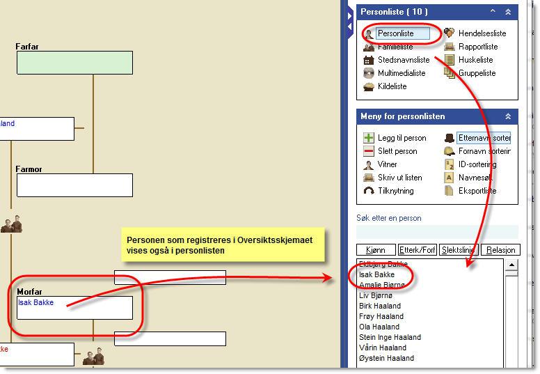 Legg også merke til at det navnet du nettopp registrerte i treet nå er synlig i personlisten til høyre på skjermen.