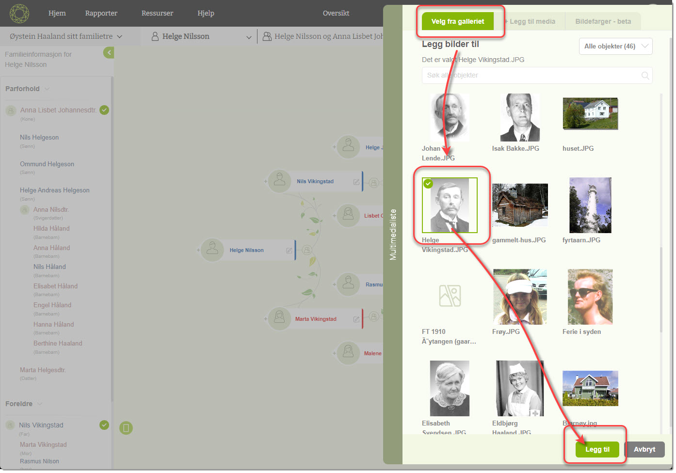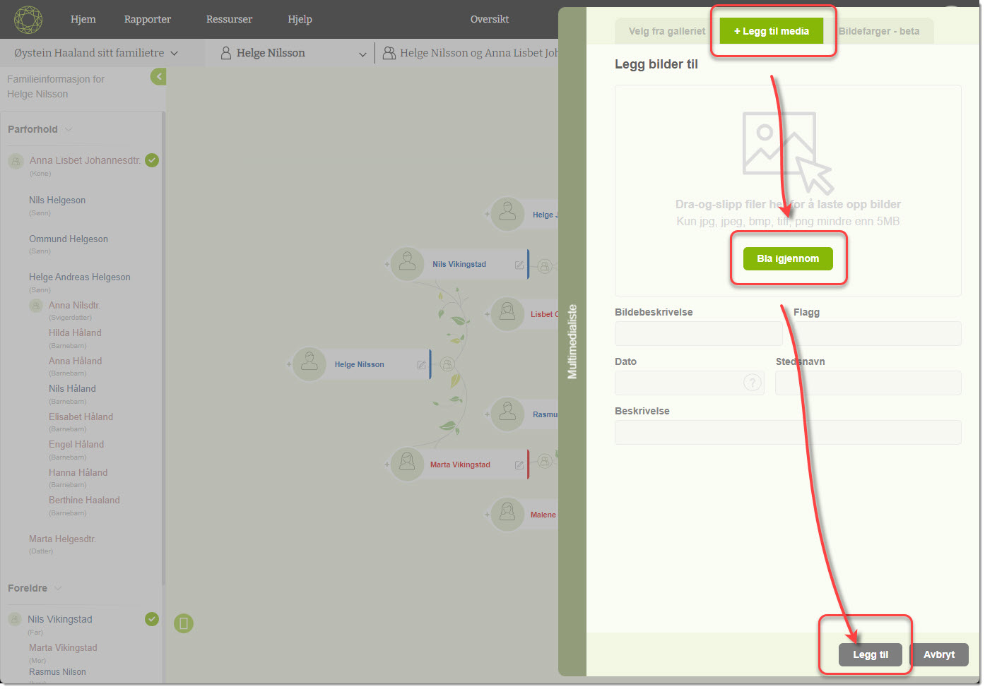 4) Hvis bildet av personen ikke er i familietreet er det mulig å legge inn nye bilder fra fanen for «Legg til media»-knappen.
