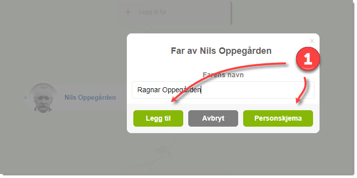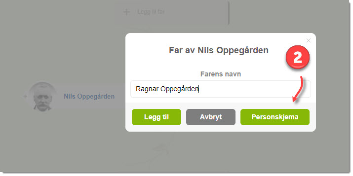 1) Ved å klikke på en av foreldrene fra Oversiktsskjemaet, vises en lite vindu for å legge til foreldrenes for- og etternavn. Ved å skrive et navn vil knappene «Legg til» og «Personskjema» bli aktivert.