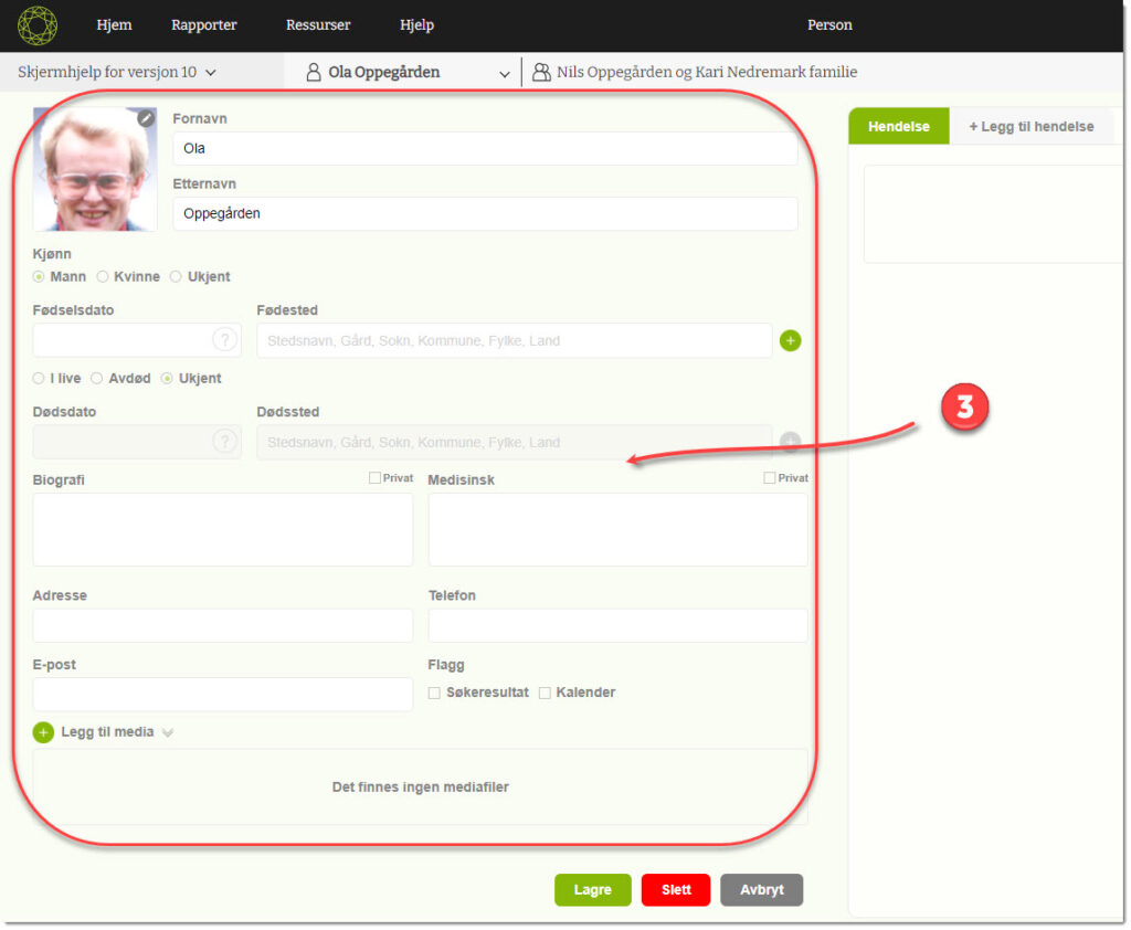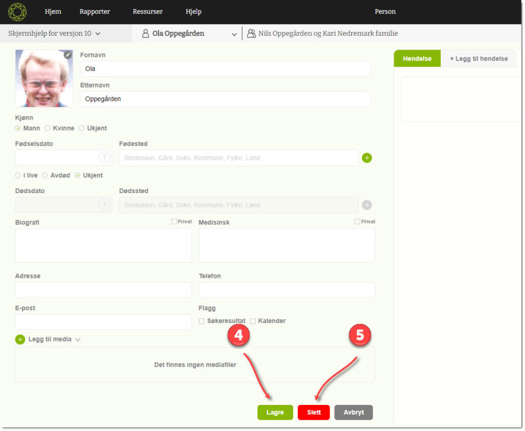 5) Hvis det er ønsker å fjerne denne personen fra famietreet er det mulig å klikke på Slett-knappen. Vær forsiktig så du ikke fjerner personer du egentlig øsnk