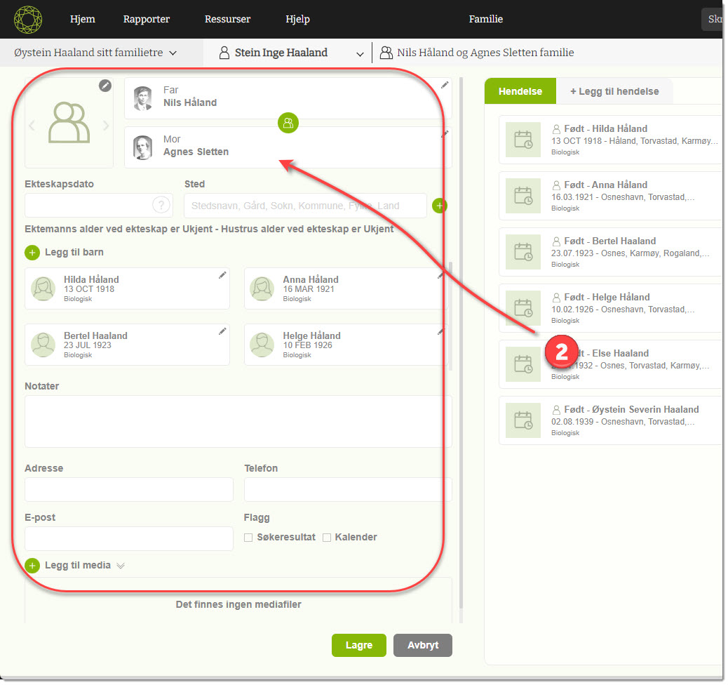 2) Ved å klikke på familieikonet, vises Familieskjemaet til den valgte familien.
