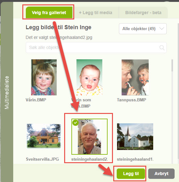 6. Hvis bildet allerede er lagret i slektsprogrammet skal man aldri legge det inn en gang til men derimot velge det fra bilde-galleriet.