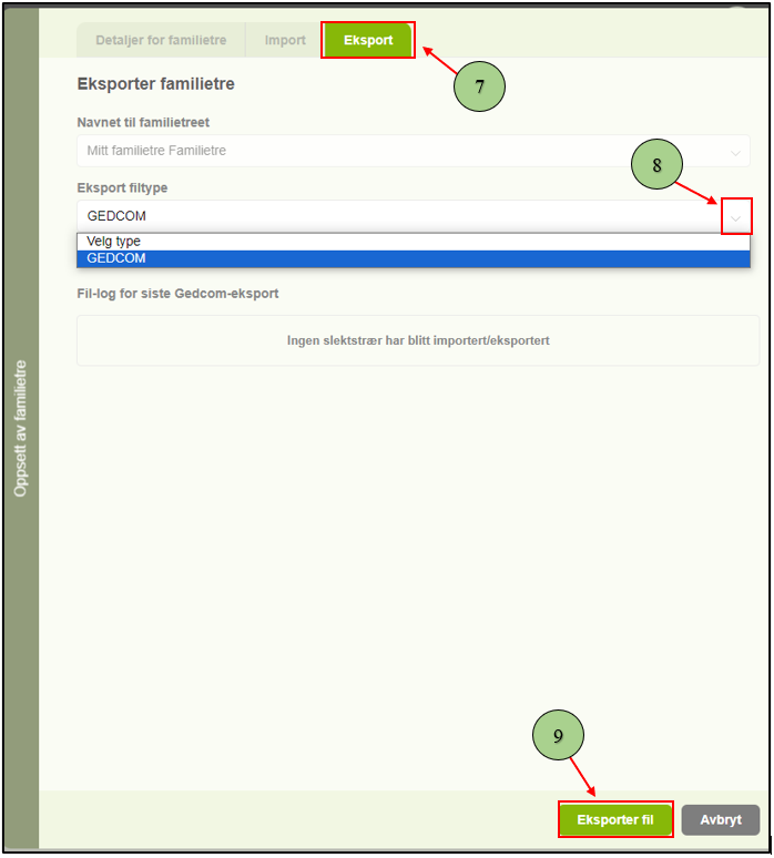 8. Velg nedtrekksikonet og velg Gedcom-typen som skal eksporteres.
