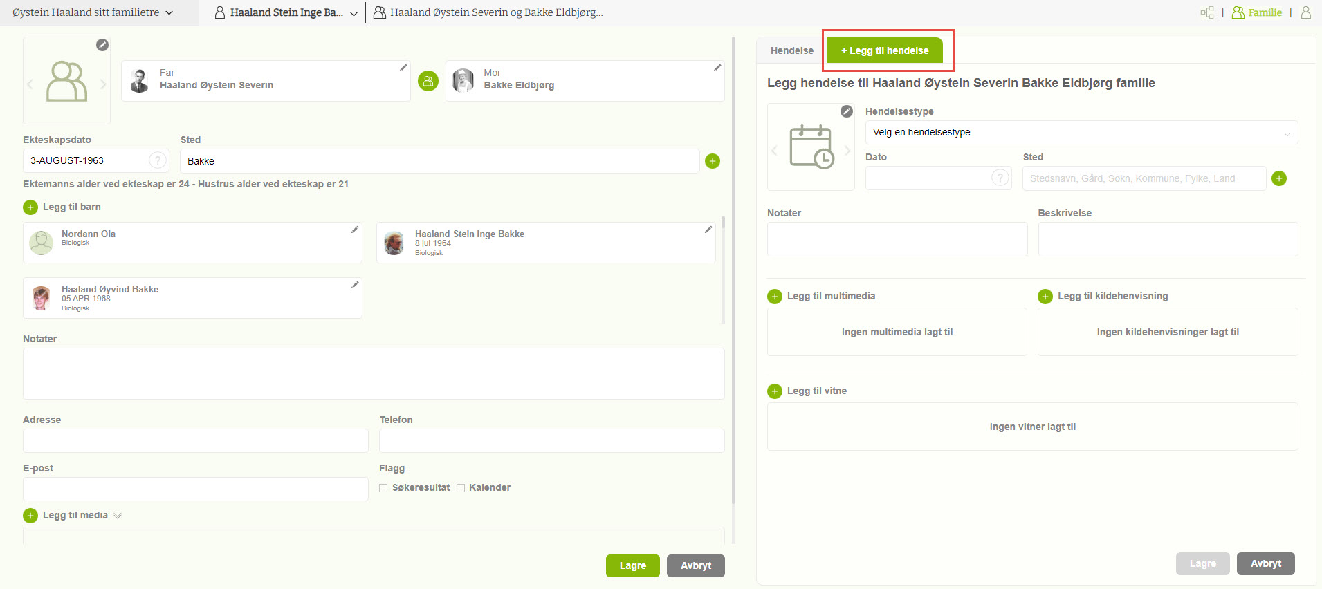 2. Legg til nye familiehendelser ved å klikke på fanen for + Legg til hendelse
