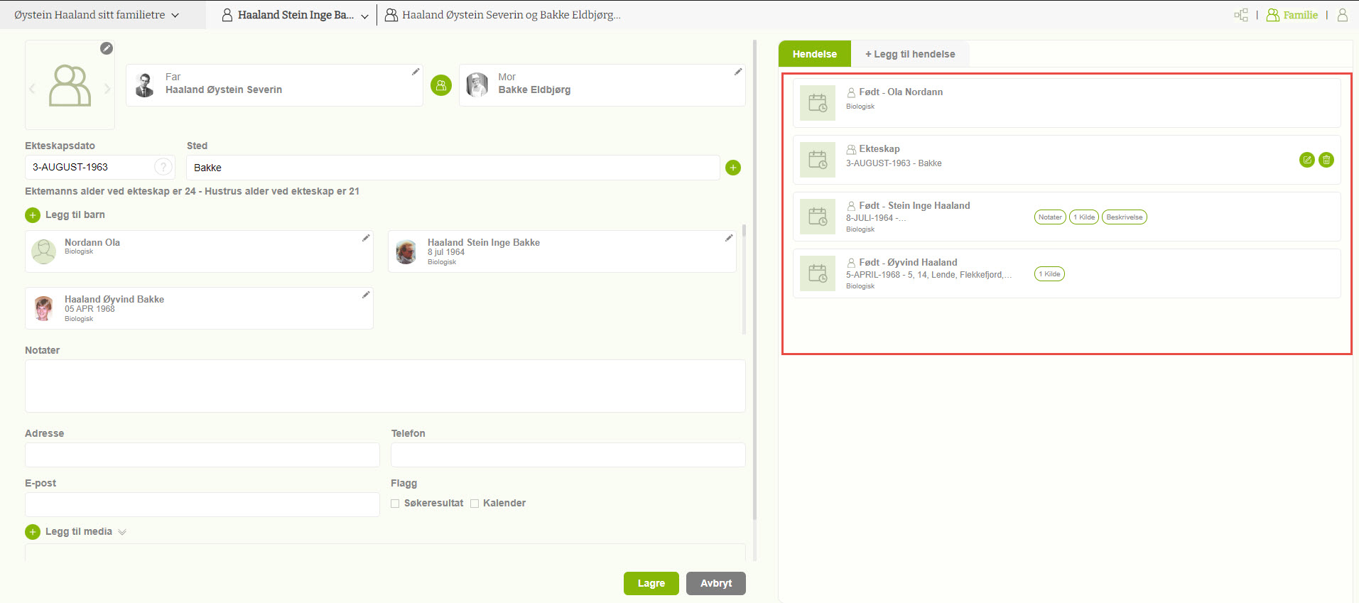 1. Familiehendelser vises på høyre side i Familieskjemaet i fanen for hendelser.