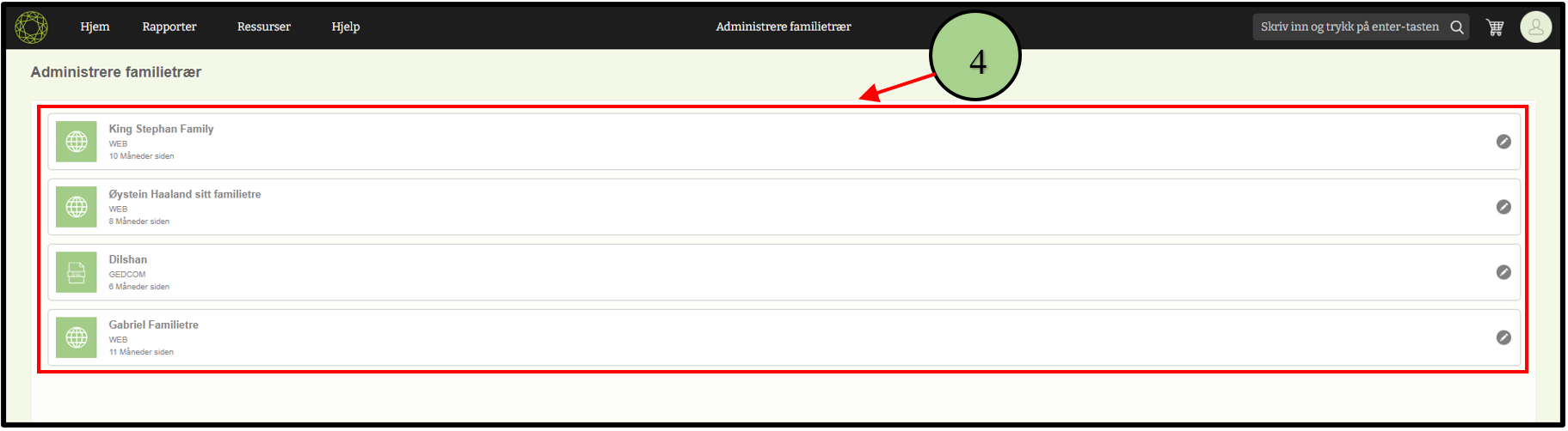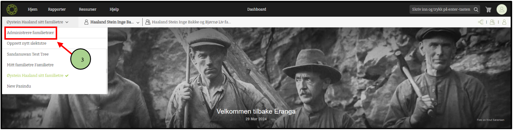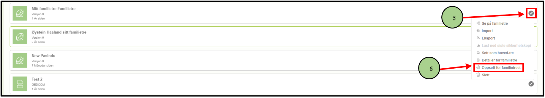 3. Velg undermenyen for å administrere familietrær