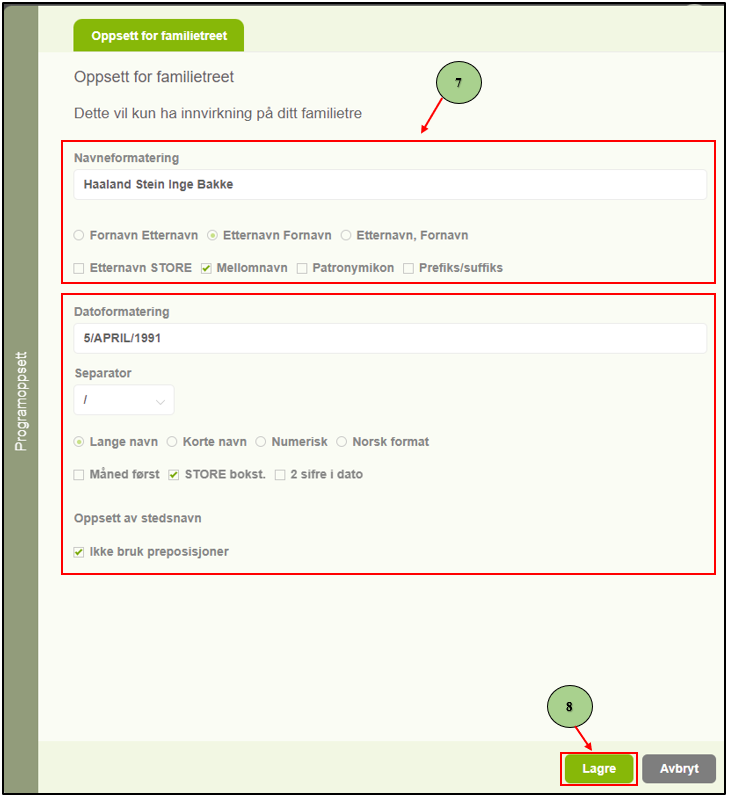 7. Et sidepanel vil komme inn fra høyre side. Her er det mange muligheter for å sette opp familietreet slik du ønsker å jobbe med det. Det er mulig å velge hvordan person-navn skal vises. Skal det kun være fornavn og etternavn eller er det ønskelig med flere navnefelt som mellomnavn, patronymikon og prefiks og suffiks. Hvis man ønsker å vise etternavn med store bokstaver er det også mulig. I hvilken rekkefølge skal navefeltene vises? Fornavn og så etternavn eller vil det føles enklere hvis etternavn vises først? Mulighetene er mange.