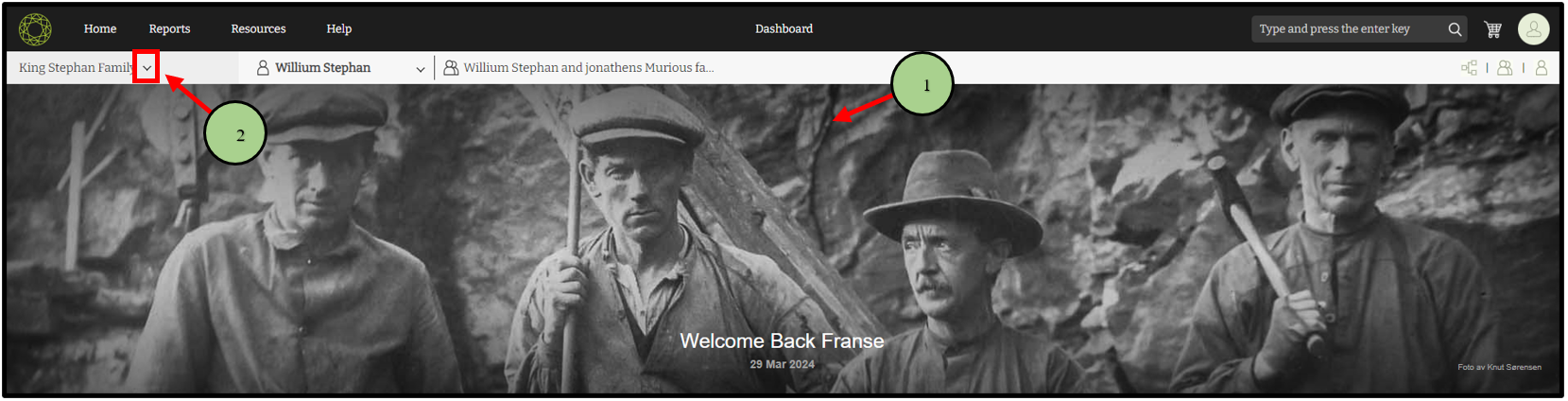 2. Klikk på nedtreksikonet rett til høyre for navnet for familietreet