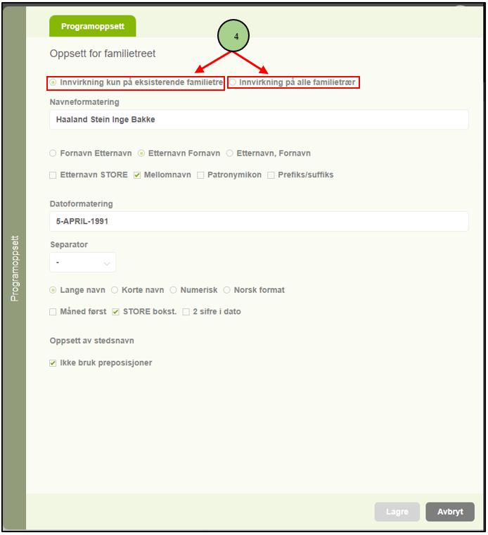 4. Et sidepanel kommer inn fra høyre i slektsprogrammet og viser to opsjonen. Den første valget har kun innvirkning på det familietreet man jobber i akkurat nå. Det andre valget er for alle familietrærne som er lagret i slektsprogrammet. De som kun har ett familietre i slektsprogrammer vil begge valg være det samme. For de som har flere familietrær må være ekstra oppmerksom på hva de gjør da det ikke er mulig å gå tilbake så snart dette valget er gjordt og alle familietrærne er forandret. Så vær forsiktig.
