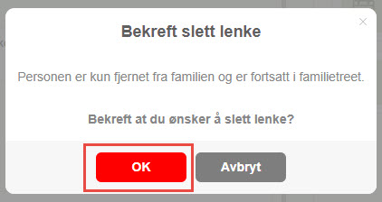 3. Det vises en liten dialogboks hvor man må klikke på den røde OK-knappen for å gjennomføre slettingen av person-lenken. For å hindre at personen blir slettet fra familien er det mulig å angre og klikke på Avbryt-knappen.