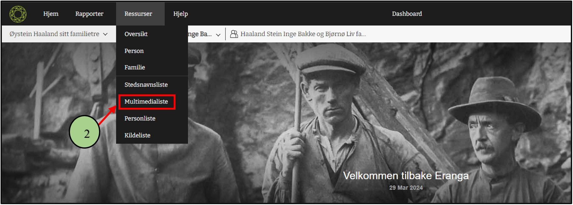 3. I multimedialisten vises alle bildene i familietreet. For hvert bilde vises et redigerings-okon. Klikk på dette for å åpne en liten meny.