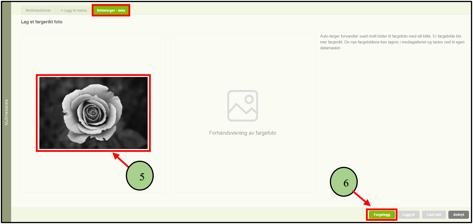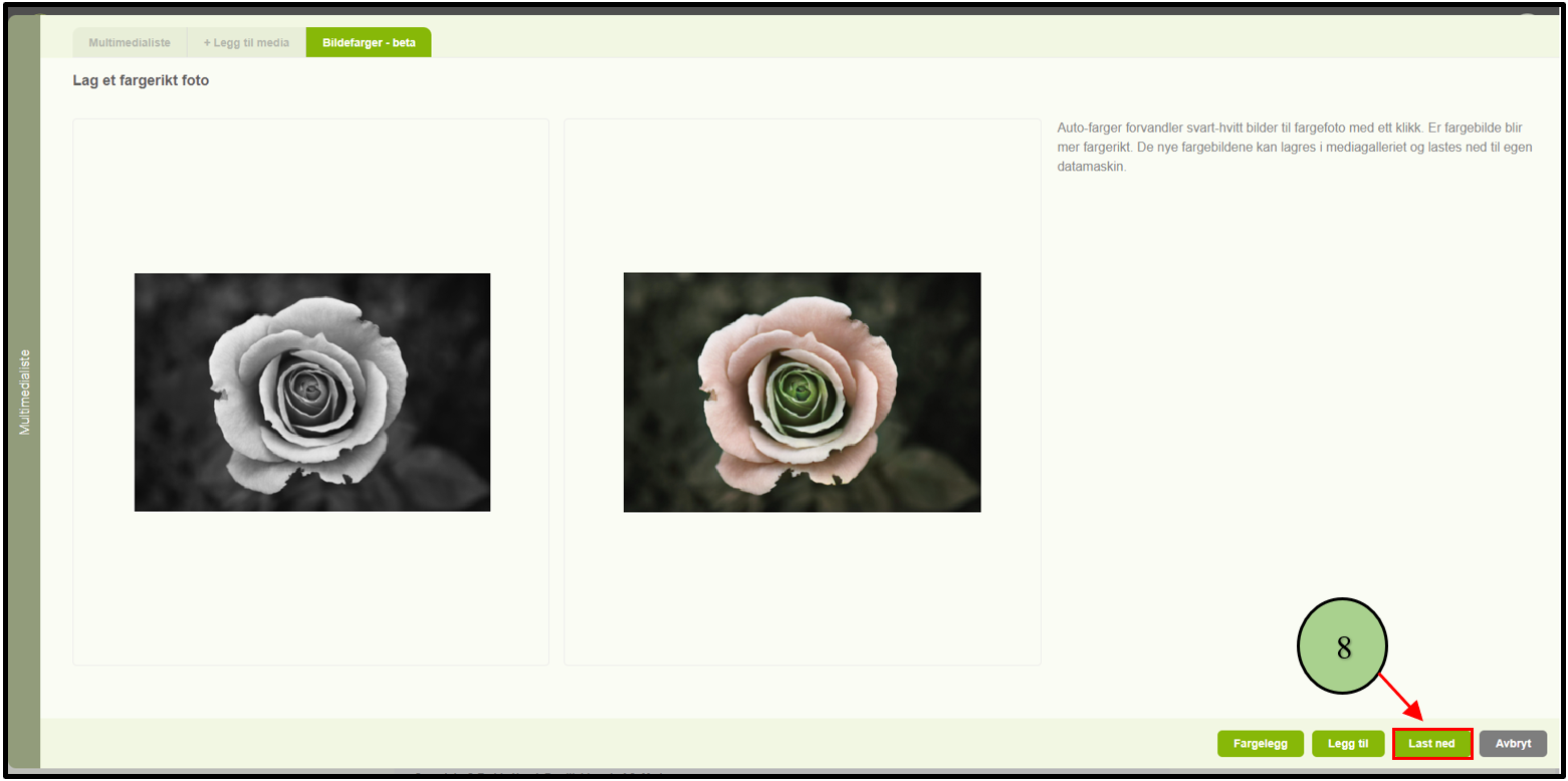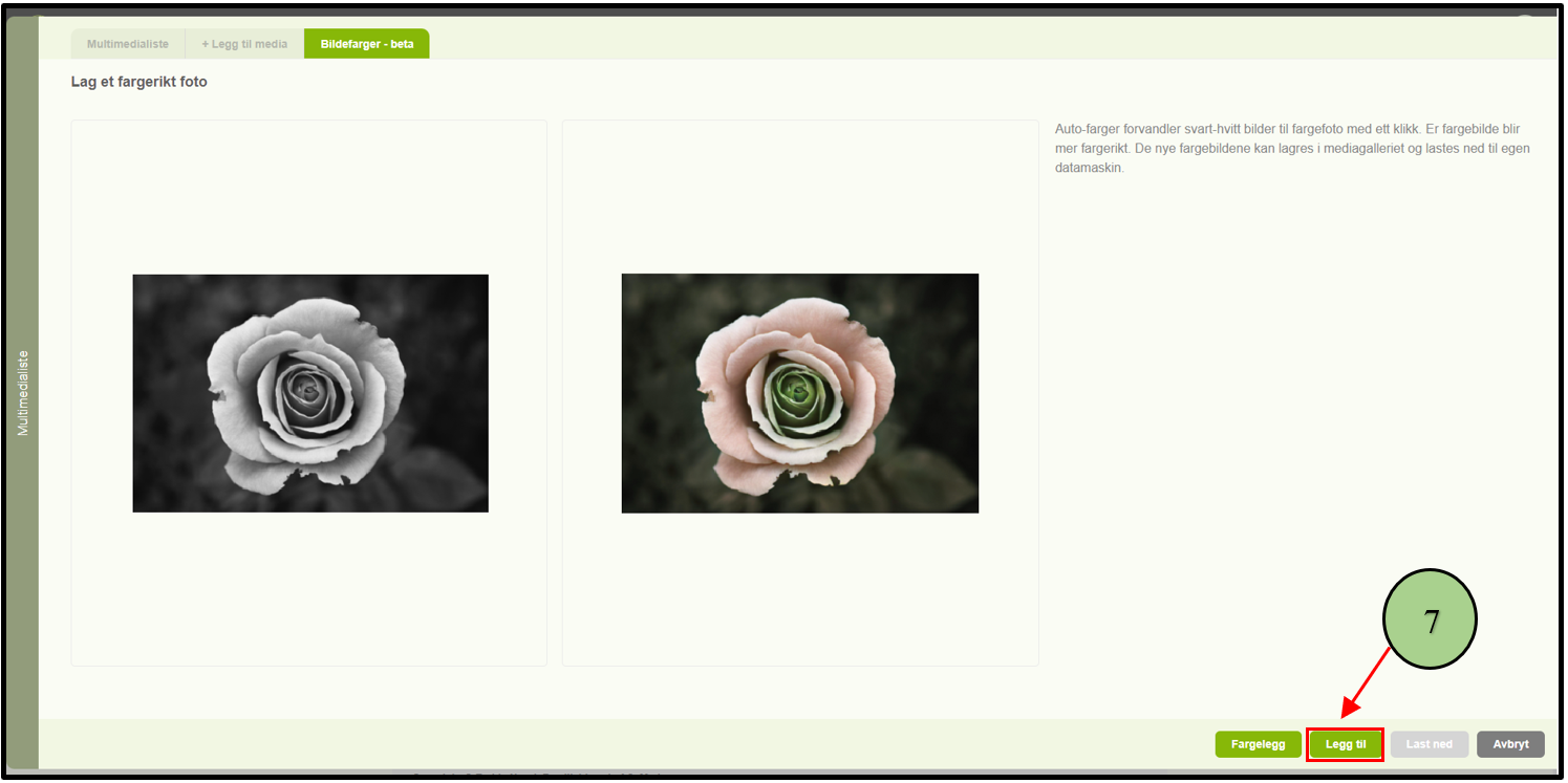 7. Bldet blir fargelagt helt automatisk med kunstig intelligens. Hvis man ønsker å beholde det nye bildet klikkes på knappen for å legge til bildet..