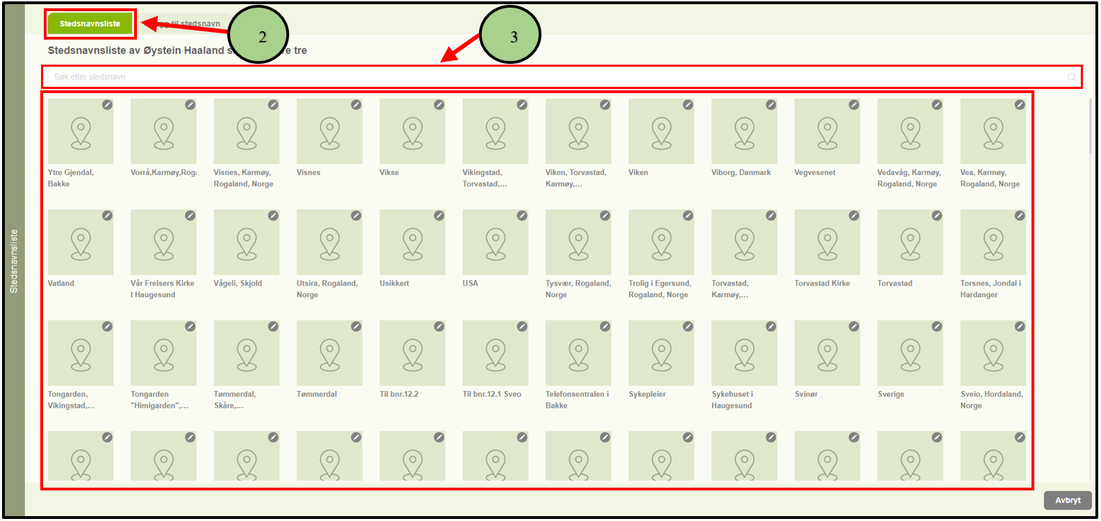 2. To faner vises hvor for første fanen viser alle stedsnavn som er registret i familietreet.
