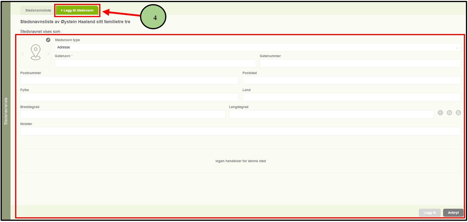 4. I den andre fanen som heter «+ Legg til stedsnavn» er det mulig å registrere et helt nytt stedsnavn. Et stedsnavn trenger ikke å være koblet til en person, familie eller hendelse. Det er helt greit å bare registrere nytt stedsnavn og bruke det senere i familietreet.