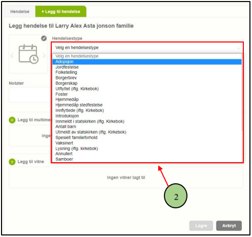 2. Programmet inneholder en lang rekke hendelser. Dette er hendelser som er definert i Gedcom-standarden slik at det er mulig å overføre familieinformasjonen til annet slektsprogram en gang i fremtiden.