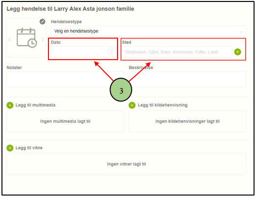 3. Til hver hendelse er det mulig å registrere dato og sted.