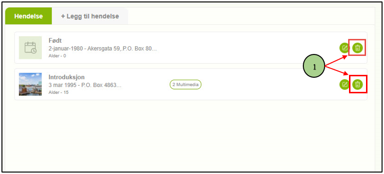 1. Det er mulig å slette en hendelse ved å klikke på slette-knappen helt til høyre for hver hendelse. Slette-knappen ser ut som en bøtte. Det er ikke mulig å få tilbake en hendelse som er slettet. Da må den legges inn på nytt.