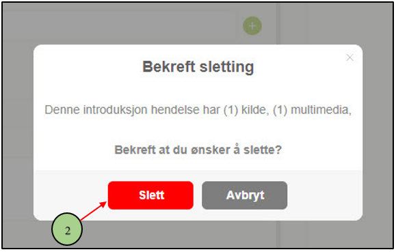 2. Ved å klikke på Slette-knappen vises et lite dialog-vindu. For å slette hedelsen permanent må man klikke den meget røde Slett-knappen. De er også mulig å angre med å klikke på Avbryt-knappen.